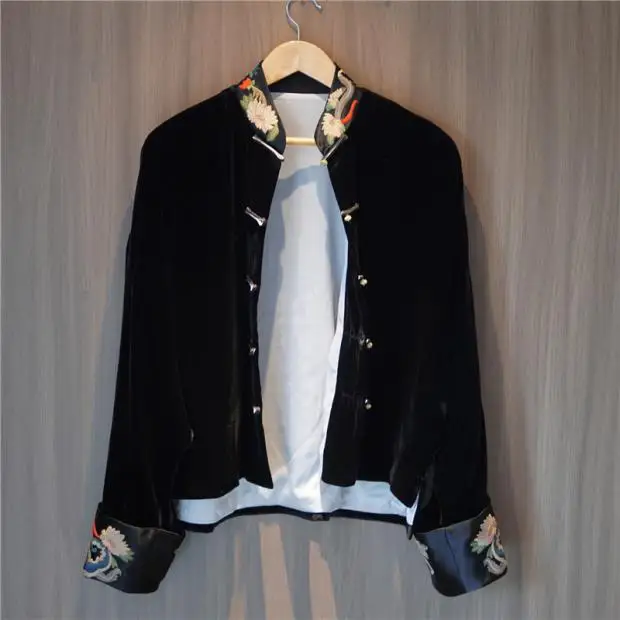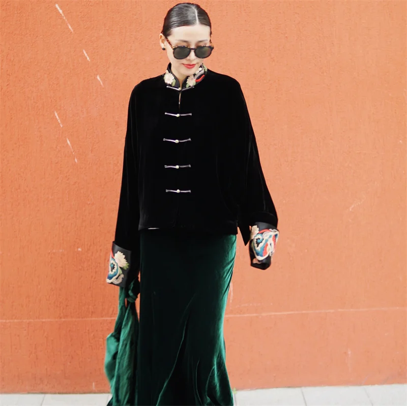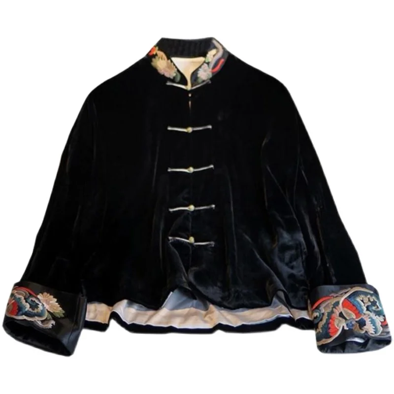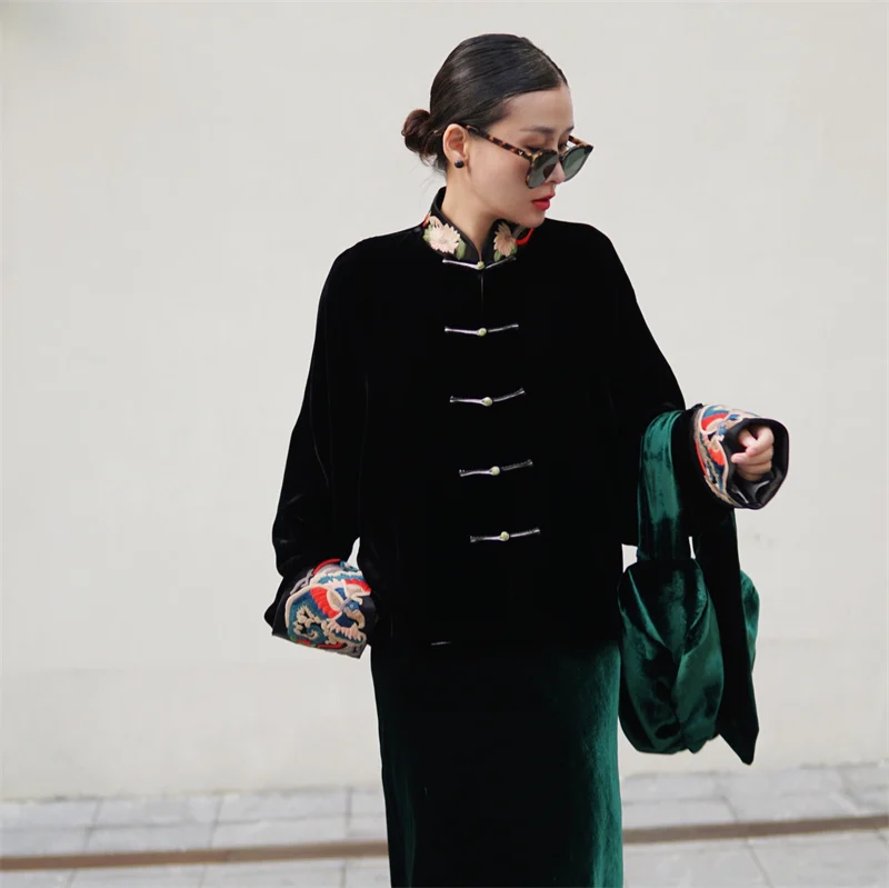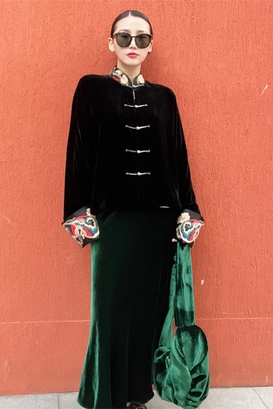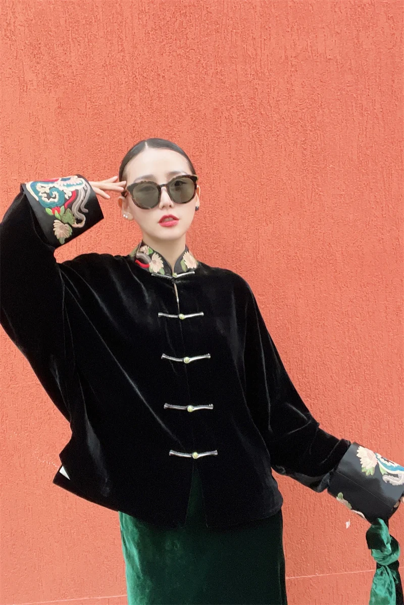 Son col mandarin brodé main et ses manches chauve-souris créent une silhouette majestueuse, fusionnant héritage Tang et design contemporain.