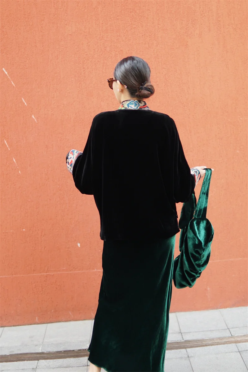 Plongez dans l'élégance impériale avec ce haut en velours de soie noir, une pièce rare aux finitions artisanales.
